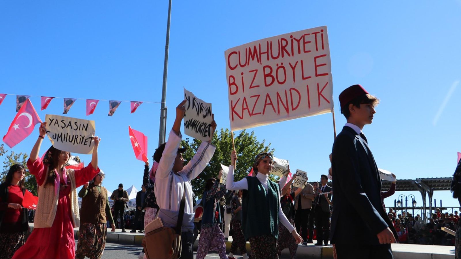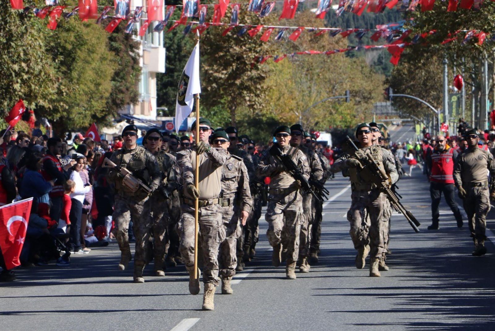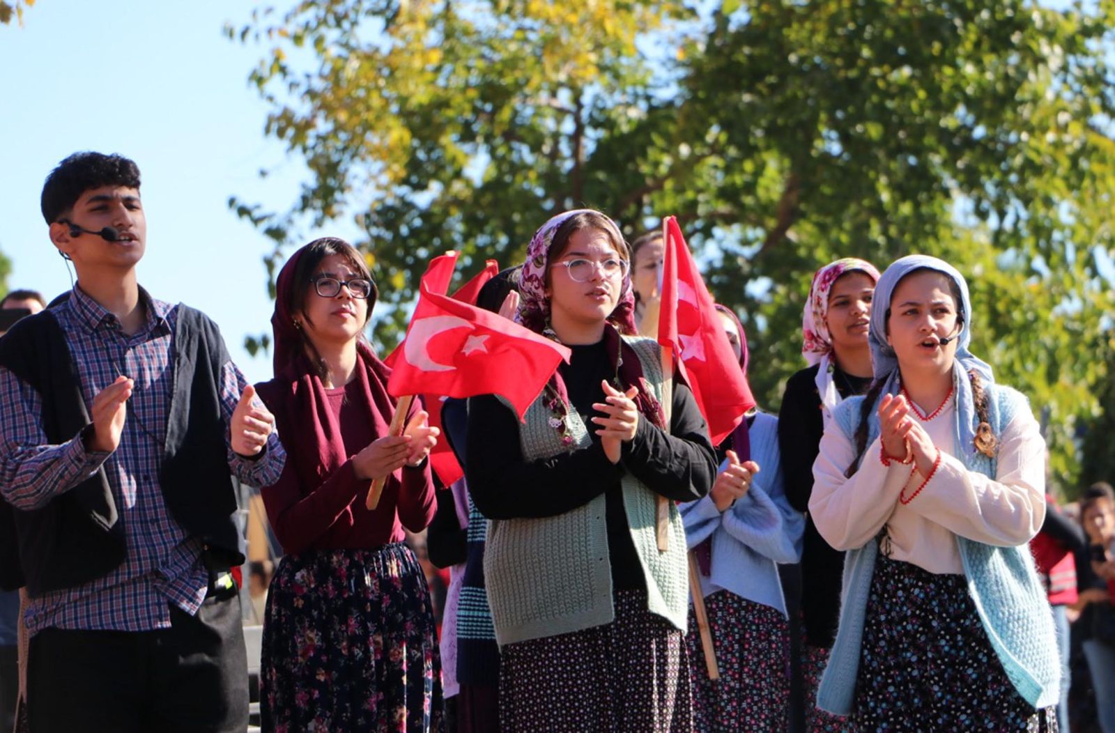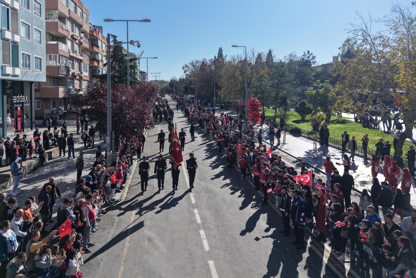 Törende kentte resmi ve özel okullar geçiş yaparken, 54’üncü Mekanize Piyade Tugay Komutanlığı’na bağlı zırhlı birlikler de halkı selamladı. Bu sırada, Kara Havacılık Komutanlığı’na bağlı 2 helikopter, tören alanının üzerinde gösteri uçuşu yaptı. Törene katılanlar, o anları cep telefonlarıyla kaydetti.