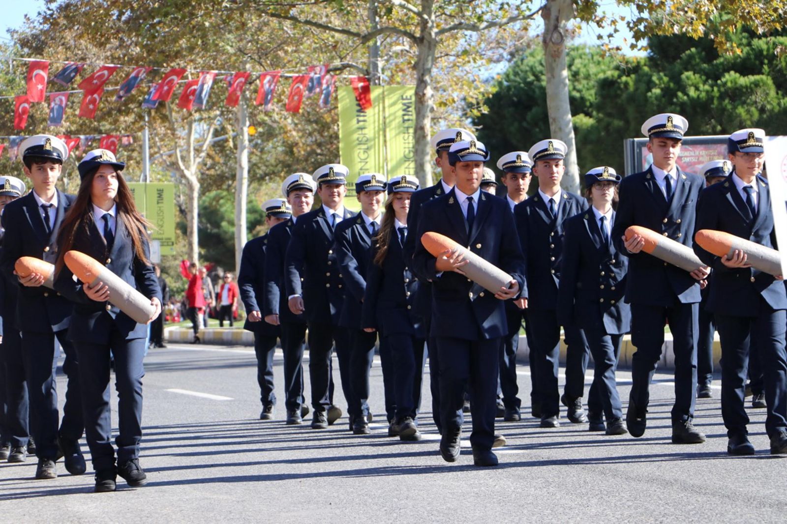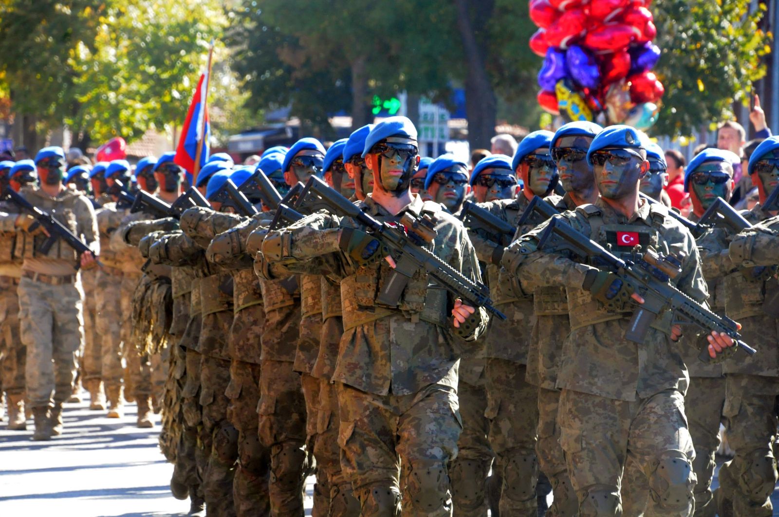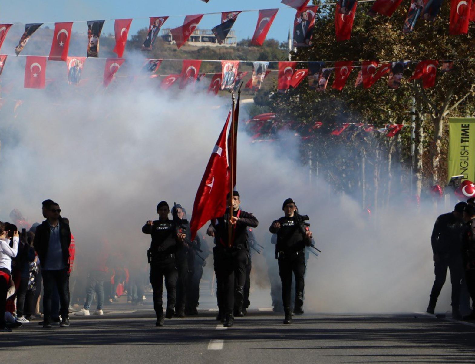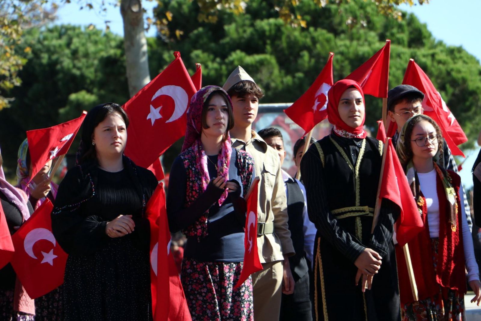 Törende kentte resmi ve özel okullar geçiş yaparken, 54’üncü Mekanize Piyade Tugay Komutanlığı’na bağlı zırhlı birlikler de halkı selamladı. Bu sırada, Kara Havacılık Komutanlığı’na bağlı 2 helikopter, tören alanının üzerinde gösteri uçuşu yaptı. Törene katılanlar, o anları cep telefonlarıyla kaydetti.