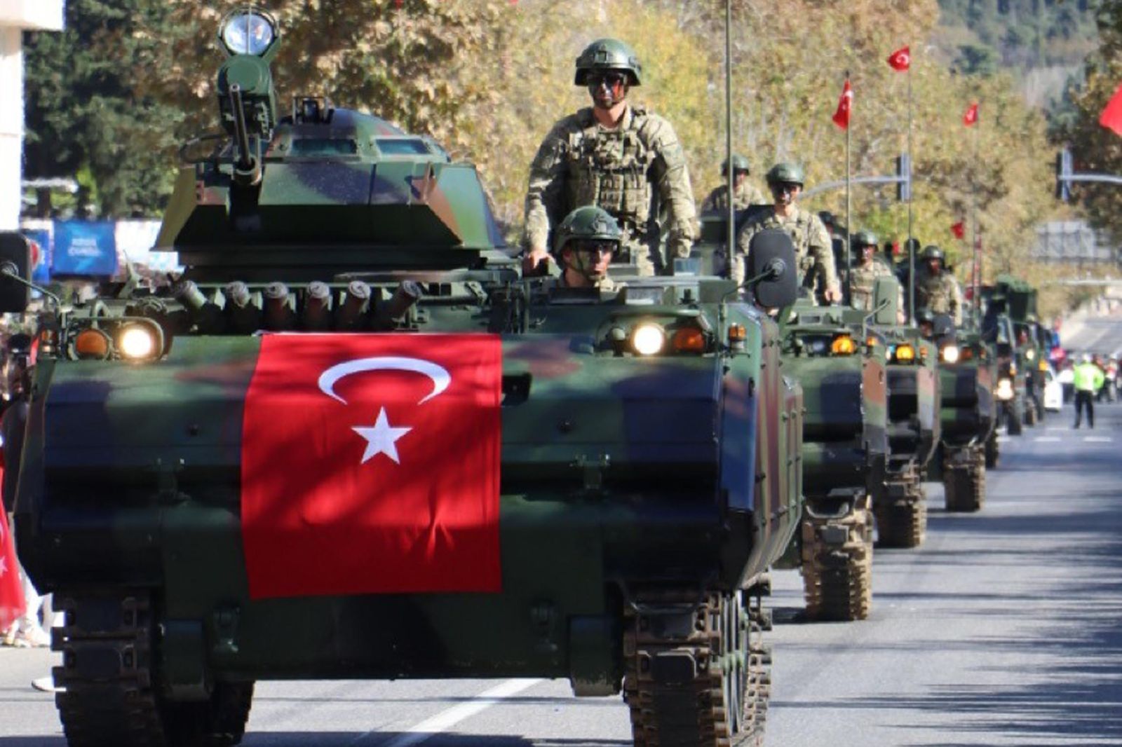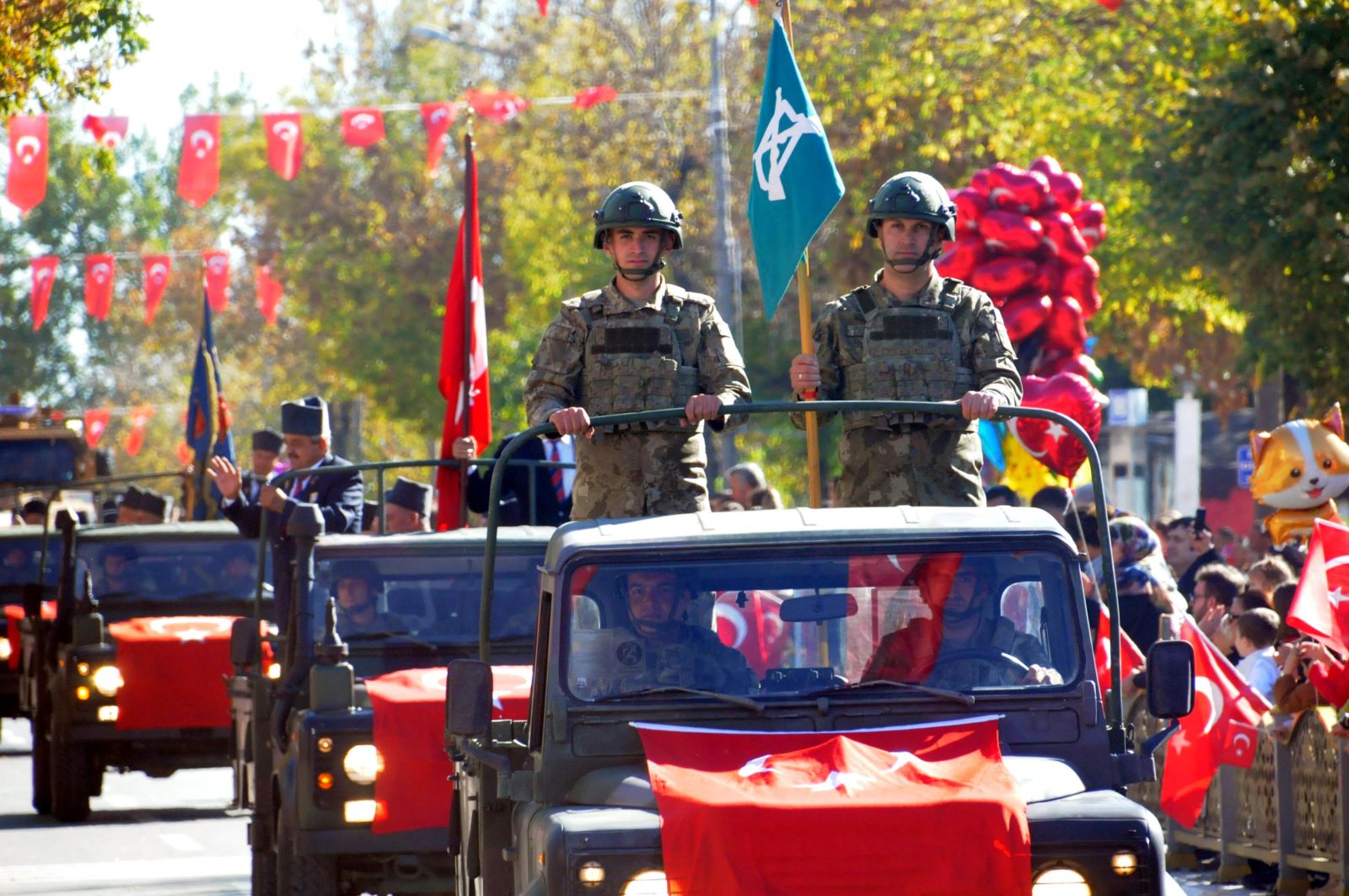 Özgürlük ve Demokrasi Meydanı'nda devam eden kutlamalarda Vali Turan, 55'inci Mekanize Piyade Tugay Komutanı Tuğgeneral Erdal Köse ve Kırklareli Belediye Başkanı Derya Bulut, askeri araçla vatandaşları selamladı.