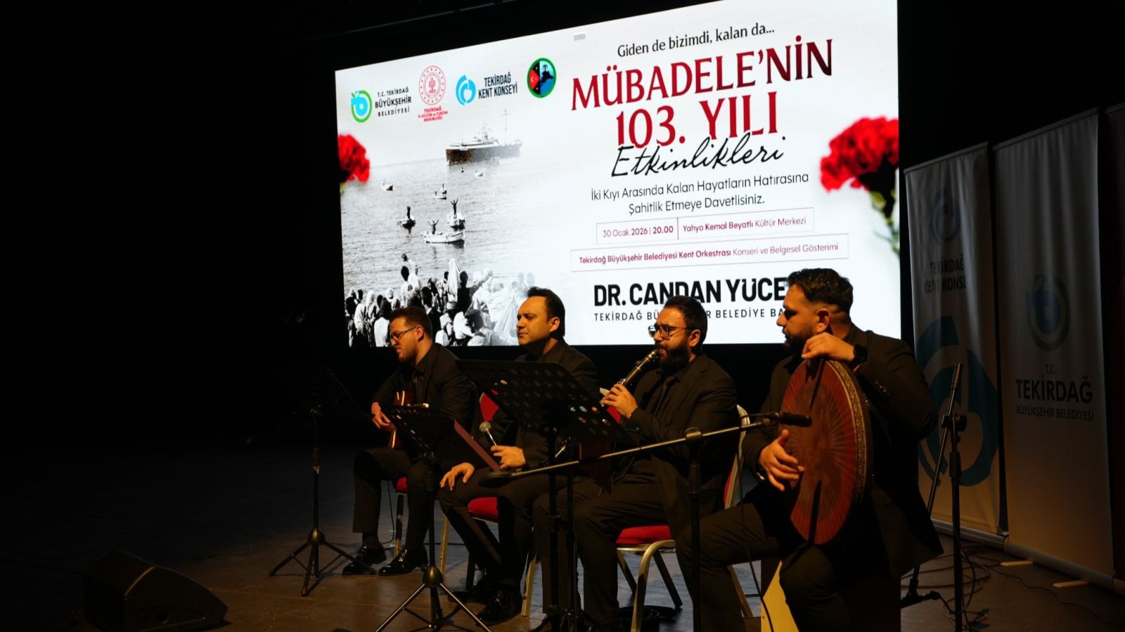 Konuşmaların ardından “Zorunlu Göçün İki Kıyısı: Selanik’ten Tekirdağ’a Mübadele” adlı belgeselden izleyiciyle buluştu. Belgesel gösterimi, Tekirdağ Büyükşehir Belediyesi Kent Orkestrası ve solist Salih Demirci’nin seslendirdiği eserlerle dönüşümlü olarak sahnelendi. Mübadele ruhunu yansıtan ezgiler ve belgesel kesitleri, katılımcılara duygu dolu anlar yaşattı.