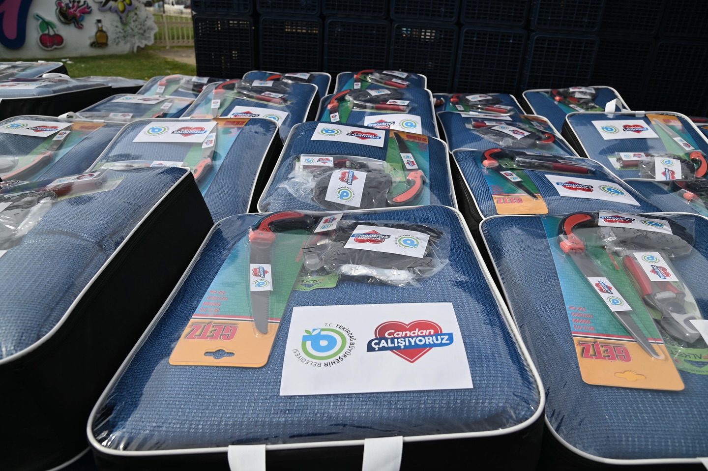 Törenin ardından, üreticilere zeytin filesi, budama makası ve testeresi, eldiven, tarak, sopa ve zeytin toplama kasasından oluşan destek paketleri teslim edildi. (Haber Bülteni)