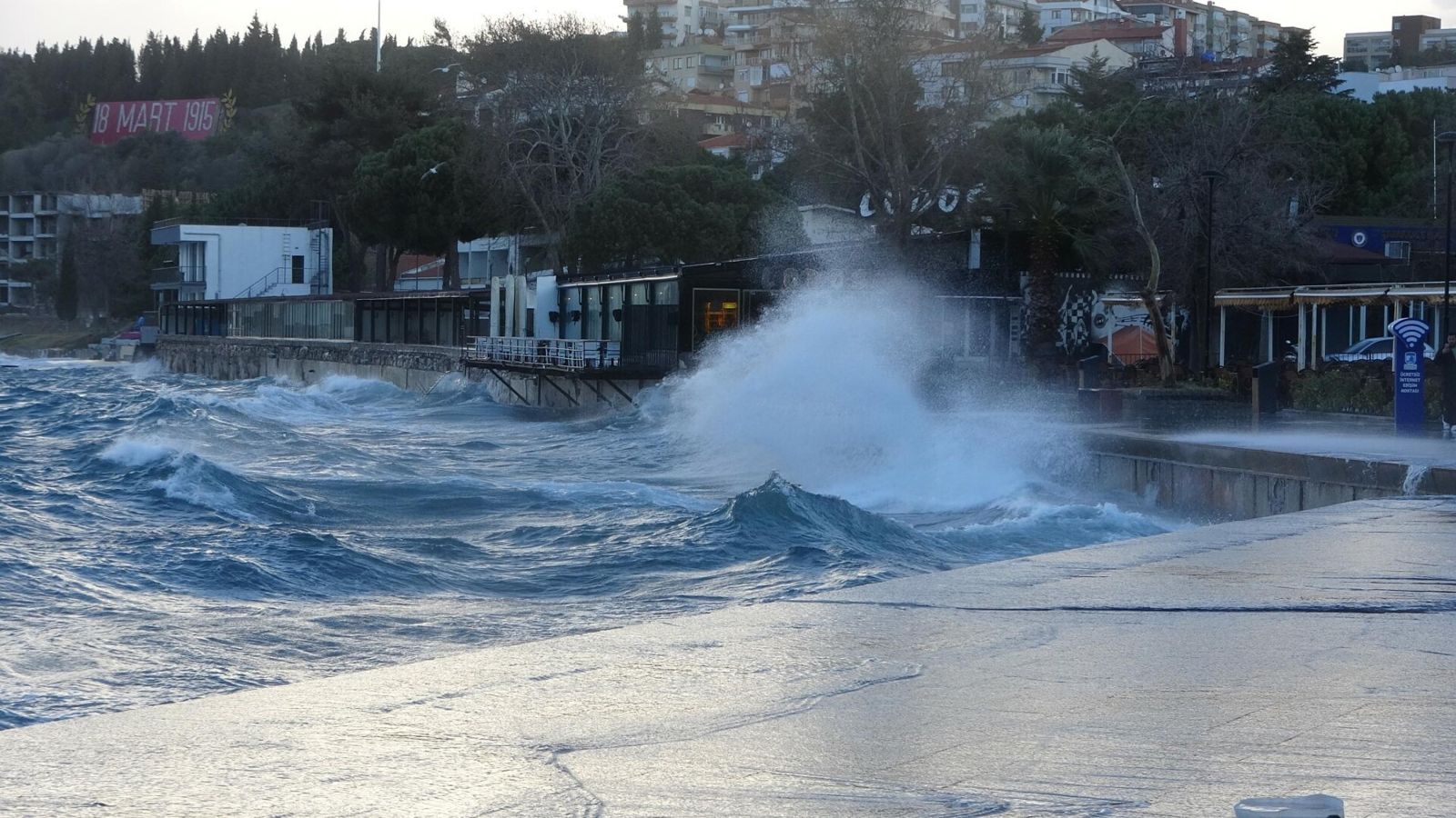 Kentte zaman zaman 90 kilometre hıza ulaşan fırtına nedeniyle oluşan dalgalar sahile vurdu. (DHA)