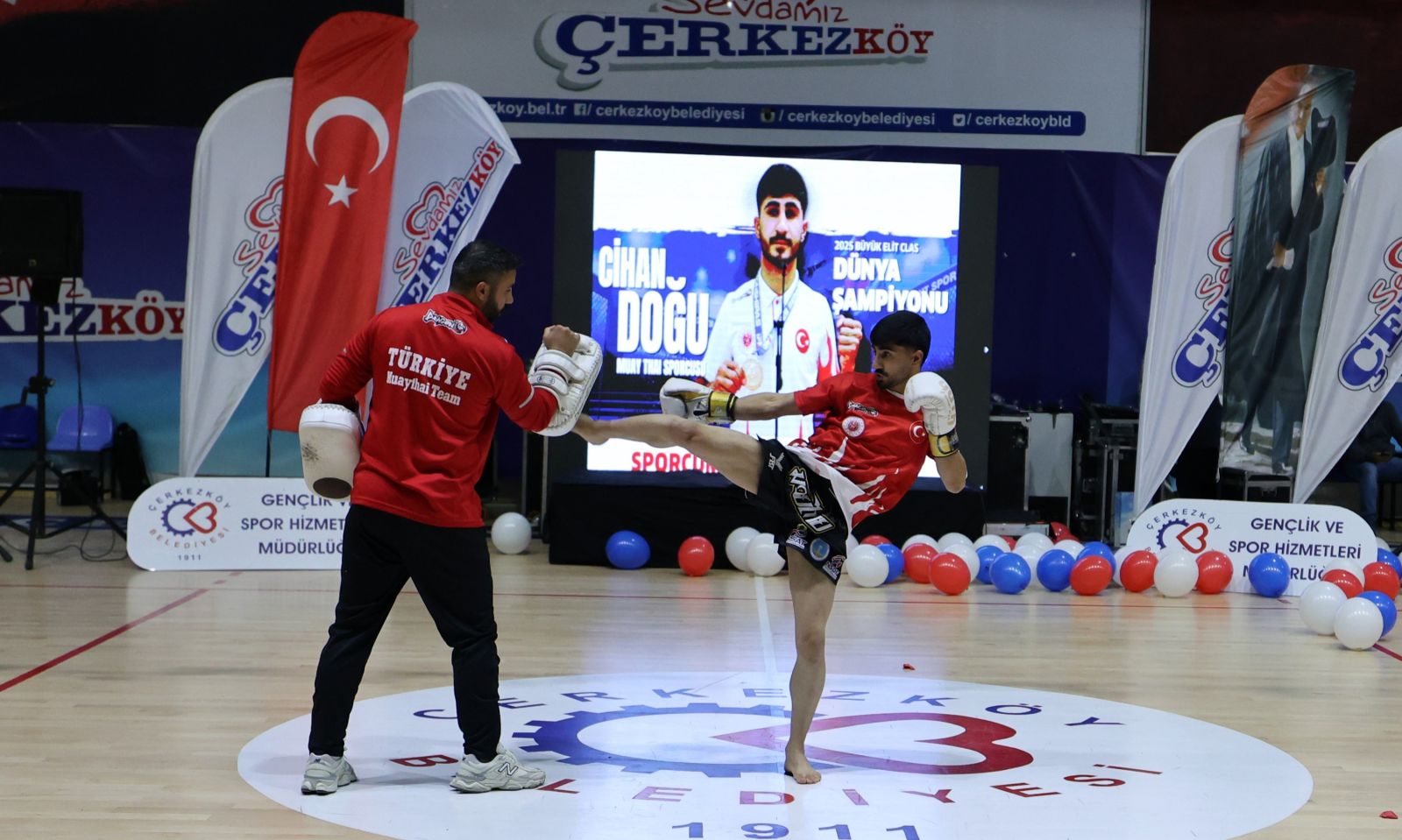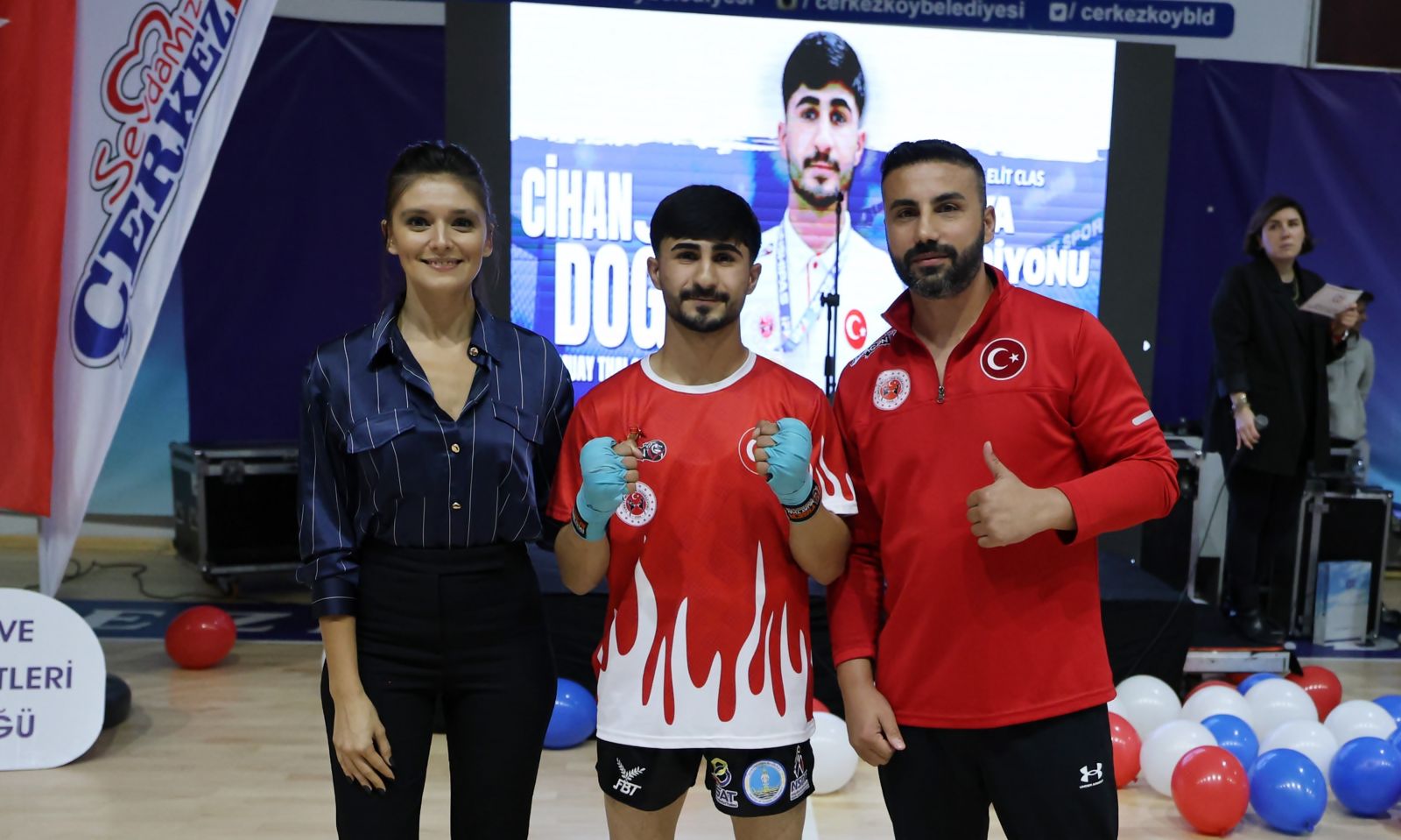 Milli sporcu ve Antrenör Yahya Geylani ve sporcularının Muay Thai gösterilerinin ardından, kentimizde Dünya Şampiyonluğu getirerek bizlere büyük bir gurur yaşatan Cihan Doğu’ya Gençlik ve Spor Hizmetleri Müdürü Cansu Çutok tarafından ödül takdim edildi.