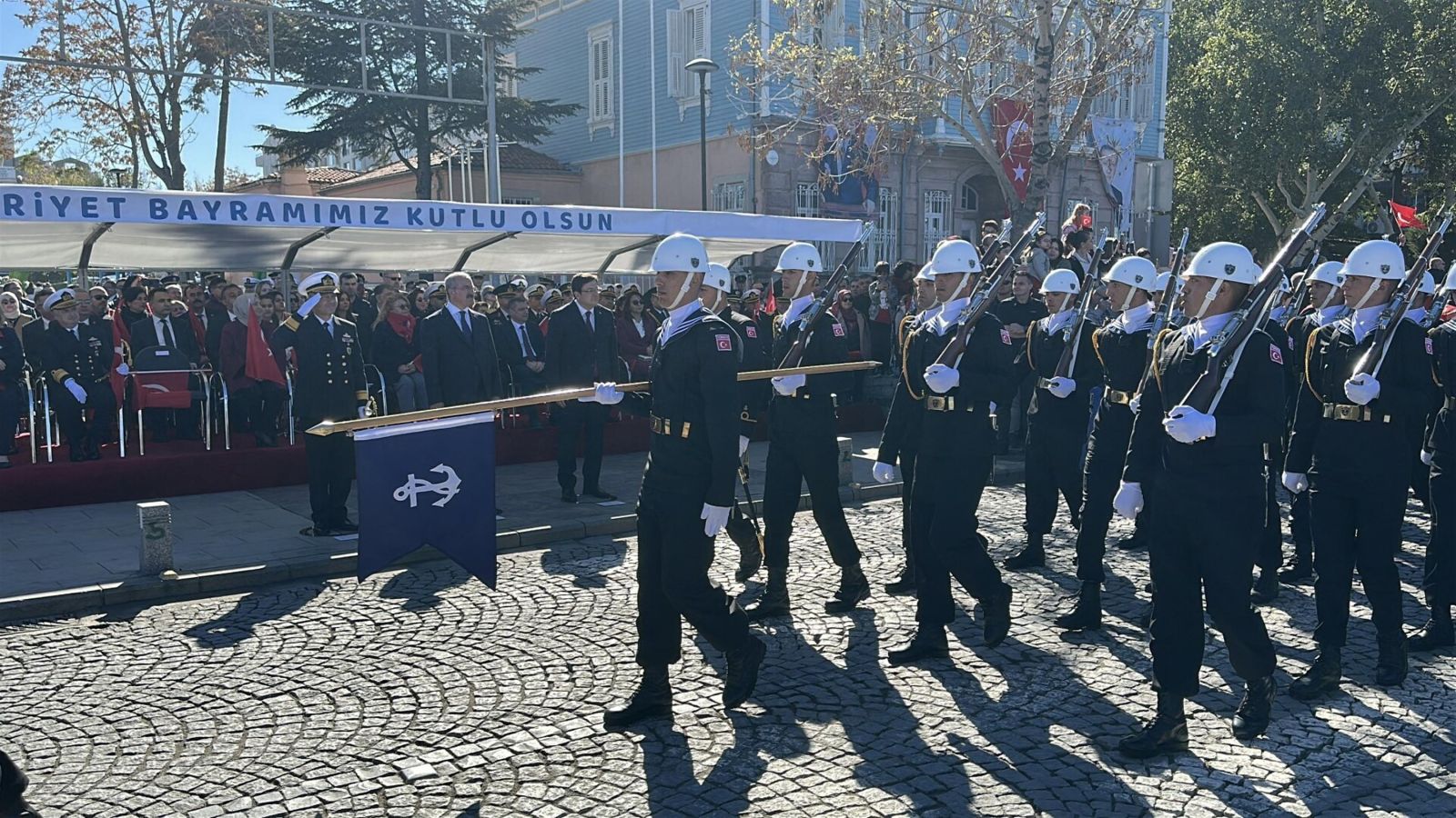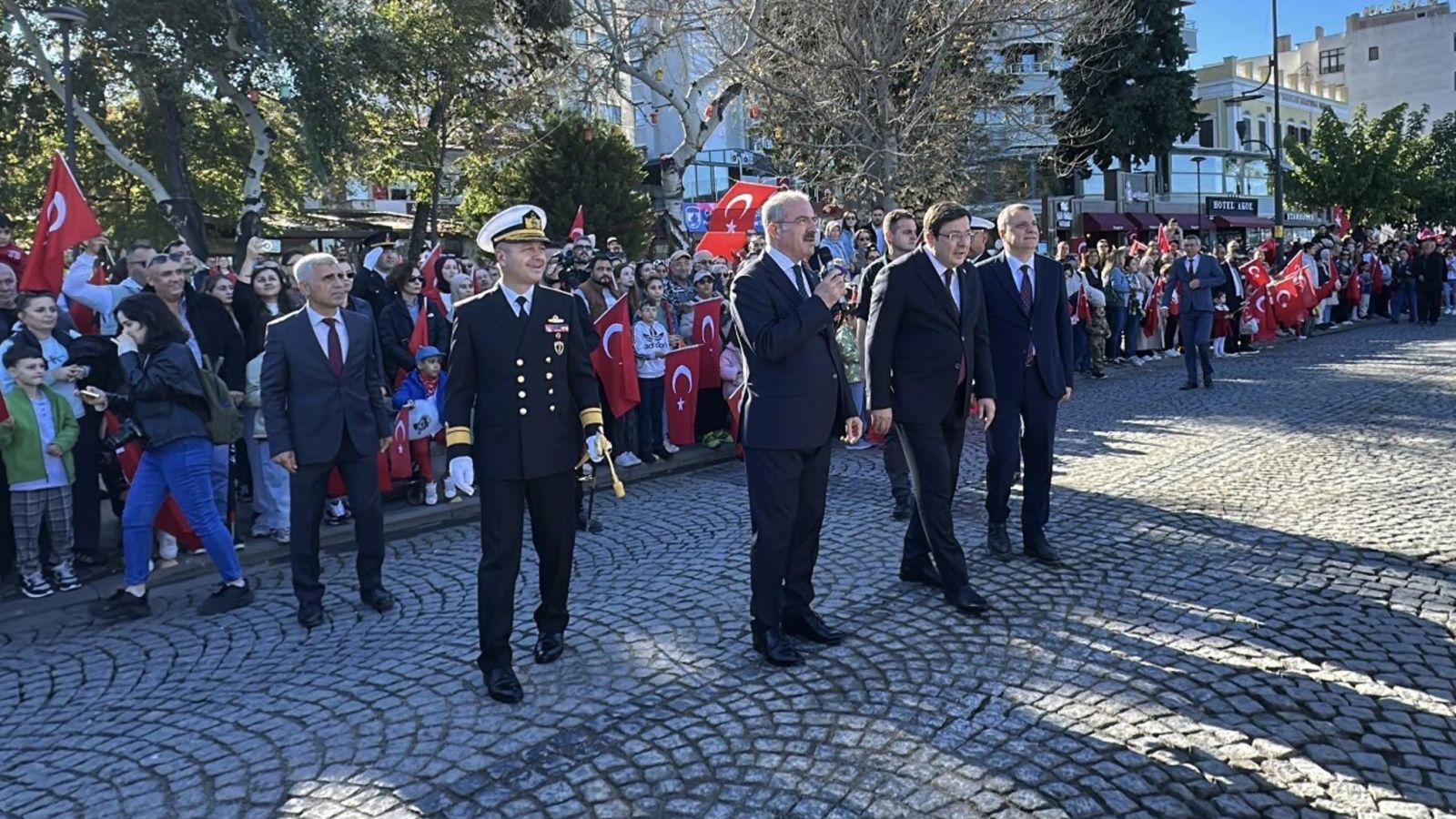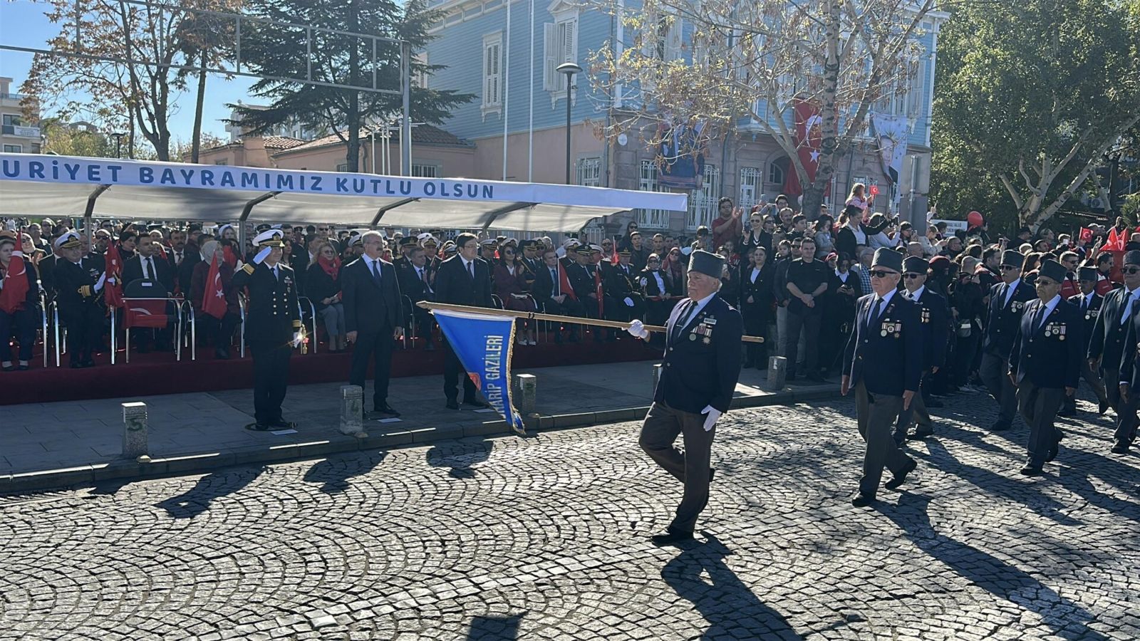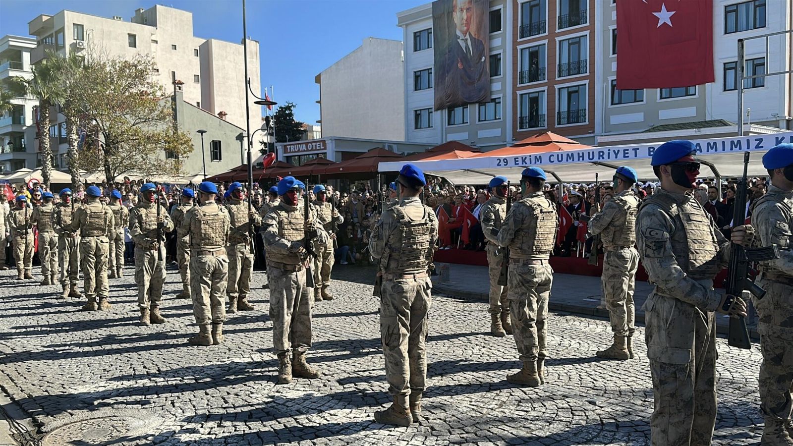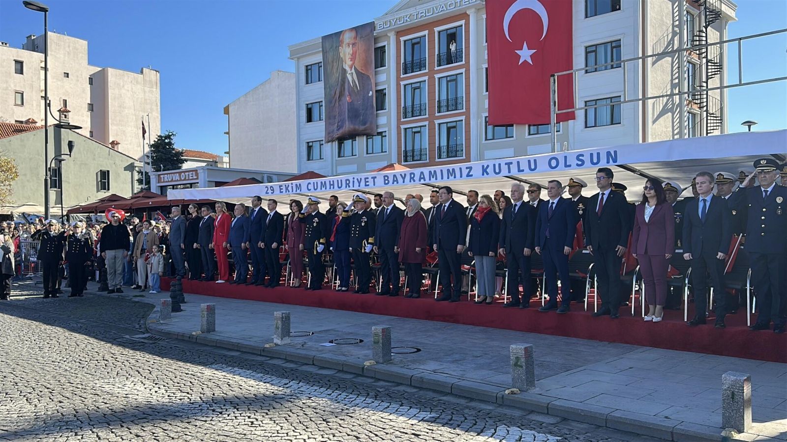 Tören, Çanakkale Valisi Ömer Toraman, Çanakkale Belediye Başkanı Muharrem Erkek ve Çanakkale Boğaz ve Garnizon Komutanı Tuğamiral Mustafa Biçen’in askerlerin ve vatandaşların Cumhuriyet Bayramı'nı kutlamasıyla başladı.