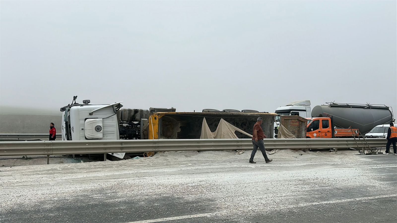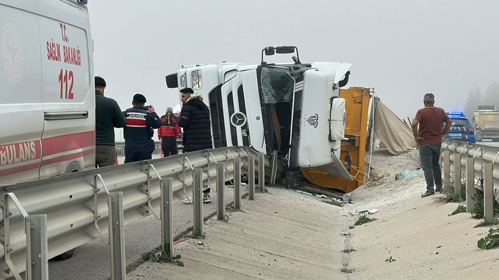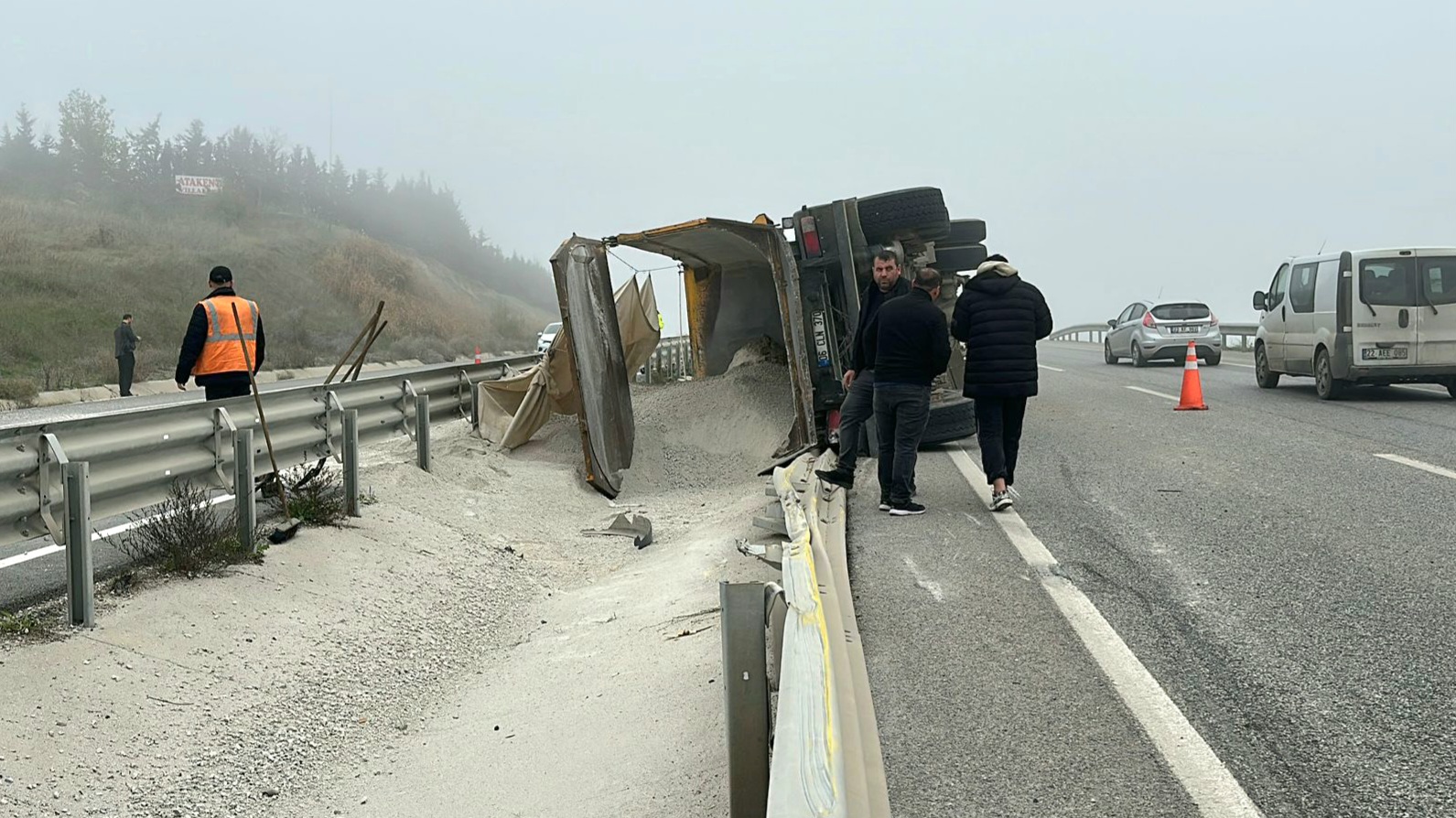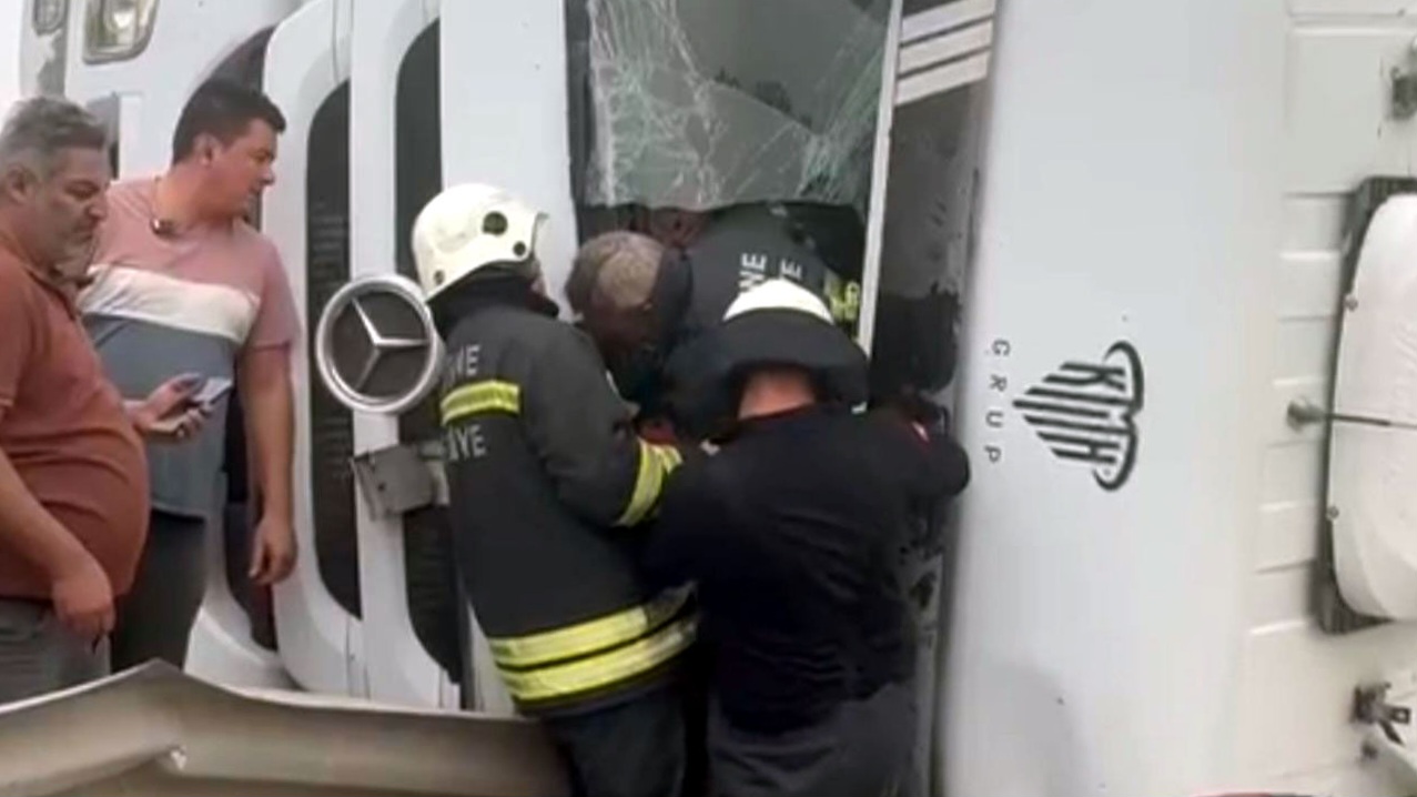 M.D.’nin kontrolünü yitirdiği 42 AJB 033 plakalı kum yüklü hafriyat kamyonu, refüj bariyerine çarparak devrildi. Kazada sürücü araçta sıkıştı.