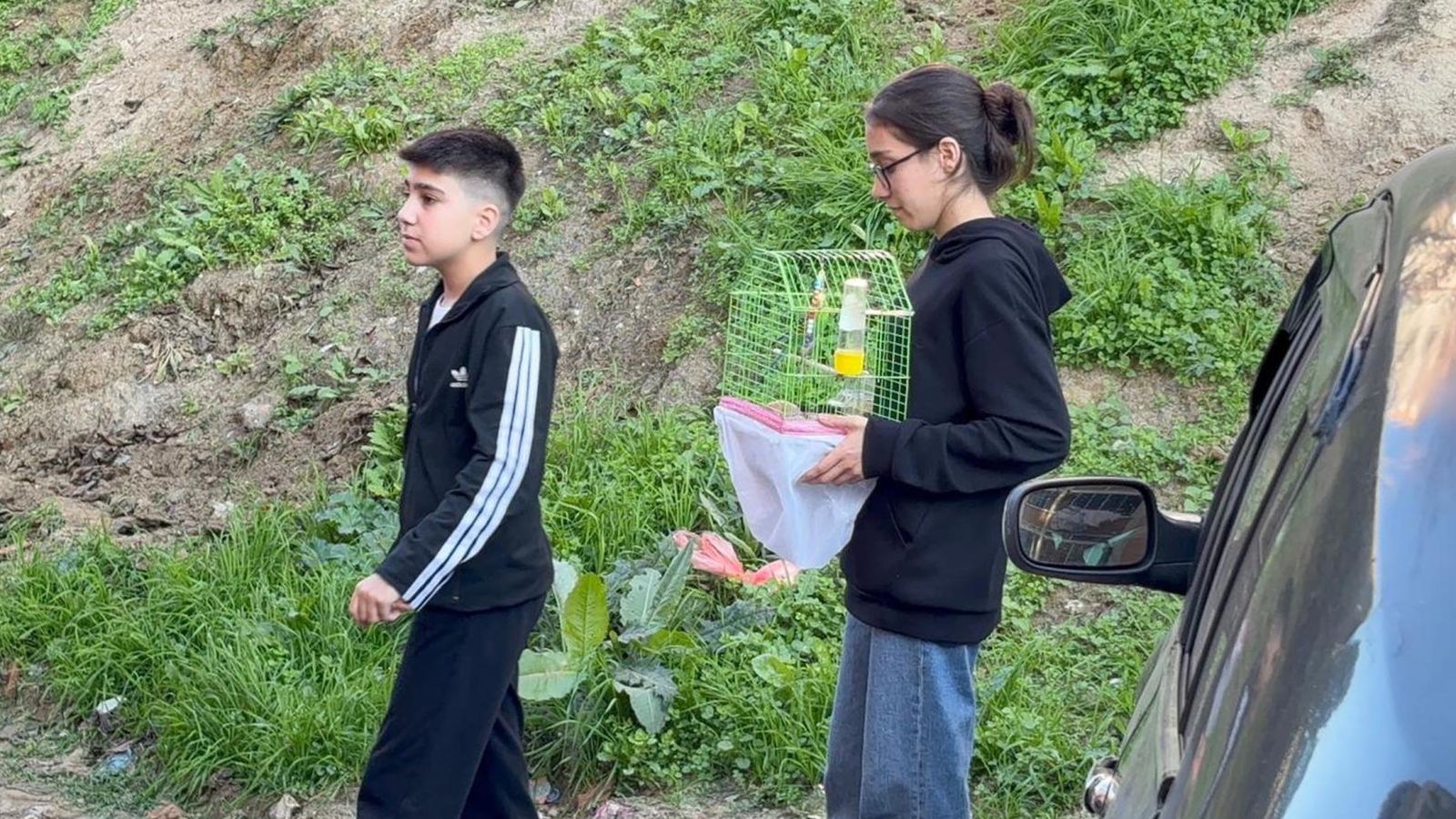 Bir kız çocuğu, apartmandan evinde beslediği kafesteki kuş ile birlikte çıktı.