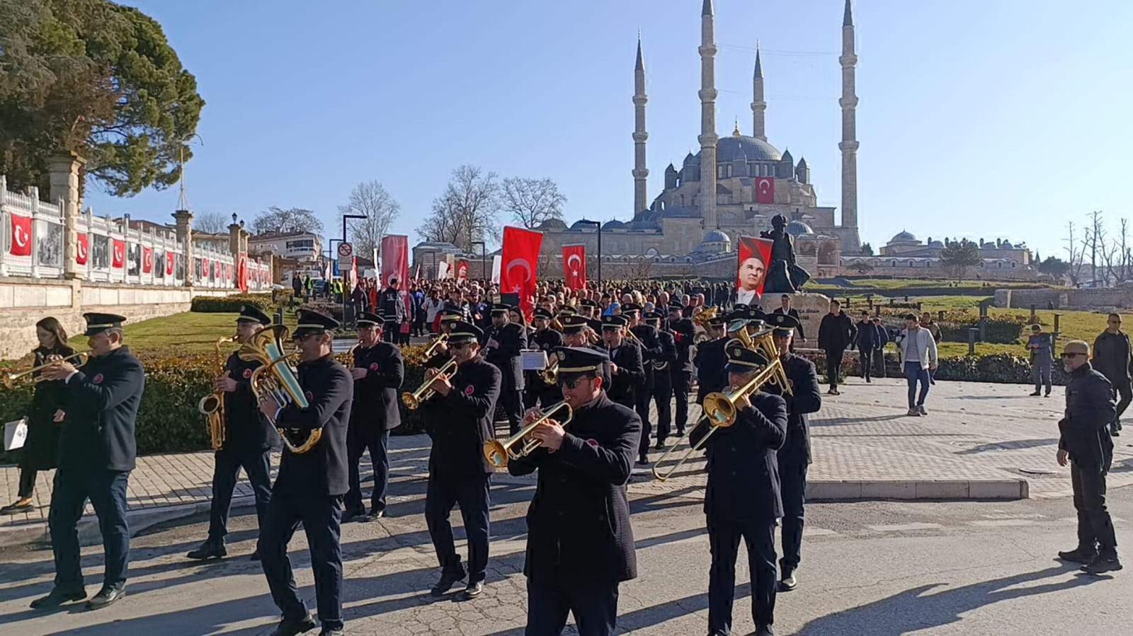 Tören öncesi, Edirne Fotoğraf Sanatı Derneği (EFOD) tarafından günün anlamına yönelik hazırlanan 'Yaşayan Edirne' fotoğraf sergisi, tarihi belediye binasında açıldı. Açılışın ardından tarihi belediye önünde toplanan ve aralarında Edirne Vali Vekili Sıdkı Zehin, Belediye Başkanı Filiz Gencan, eski belediye başkanları Güngör Mazlum ve İbrahim Ay, Ticaret ve Sanayi Odası Başkanı Sezai Irmak'ın da bulunduğu kortej, Atatürk Anıtı'na yürüdü. Saygı duruşu ve İstiklal Marşı'nın okunmasının ardından anıta çelenk sunuldu.