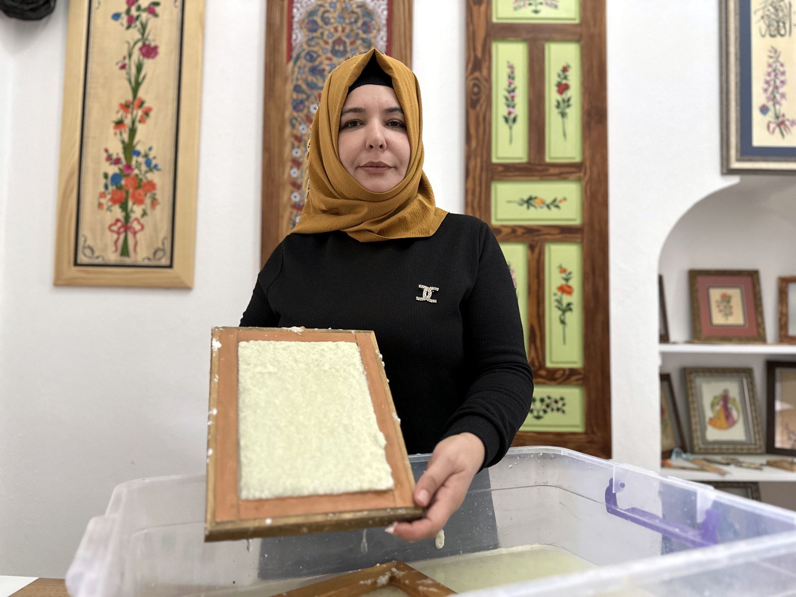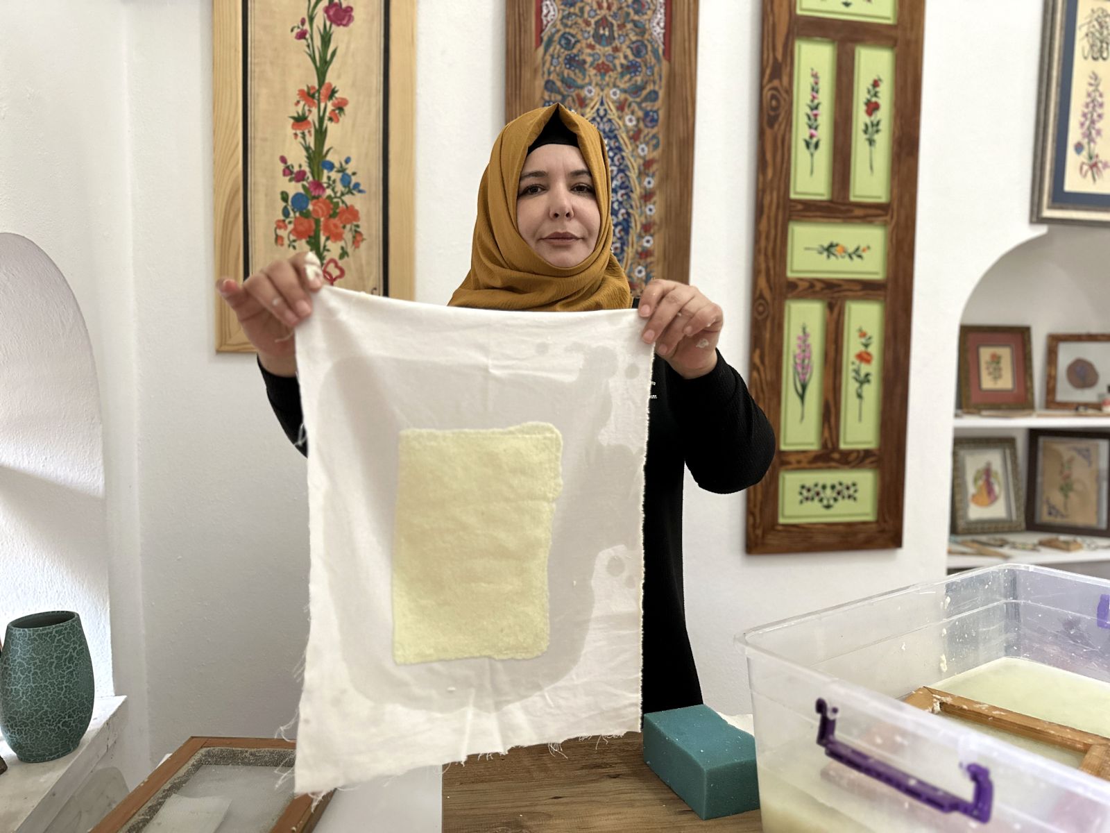 El yapımı kağıdın, 20 günde oluştuğunu söyleyen Güler, “El yapımı kağıdın bir yapılış serüveni var. Çeşitli materyaller kullanabiliyoruz; bitkisel lifler, pamuk, talaş tozu. Onları belli oranda karıştırıp 20 gün kadar selülozlaşmasını sağlıyoruz. Ondan sonra da 20 gün sonra bu kağıt haline gelmiş oluyor ve sonra da tekneye alıp onları bez üzerine çıkarıp kağıt olarak sonra da mühreliyoruz onları ve desen çizimle hazır hale geliyor. Sonra da onları Edirnekâri desenleriyle bezliyoruz" diye konuştu.