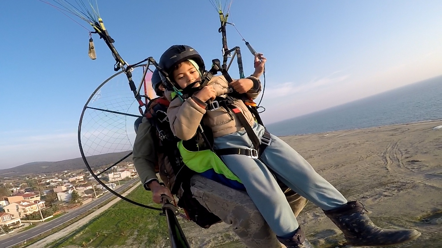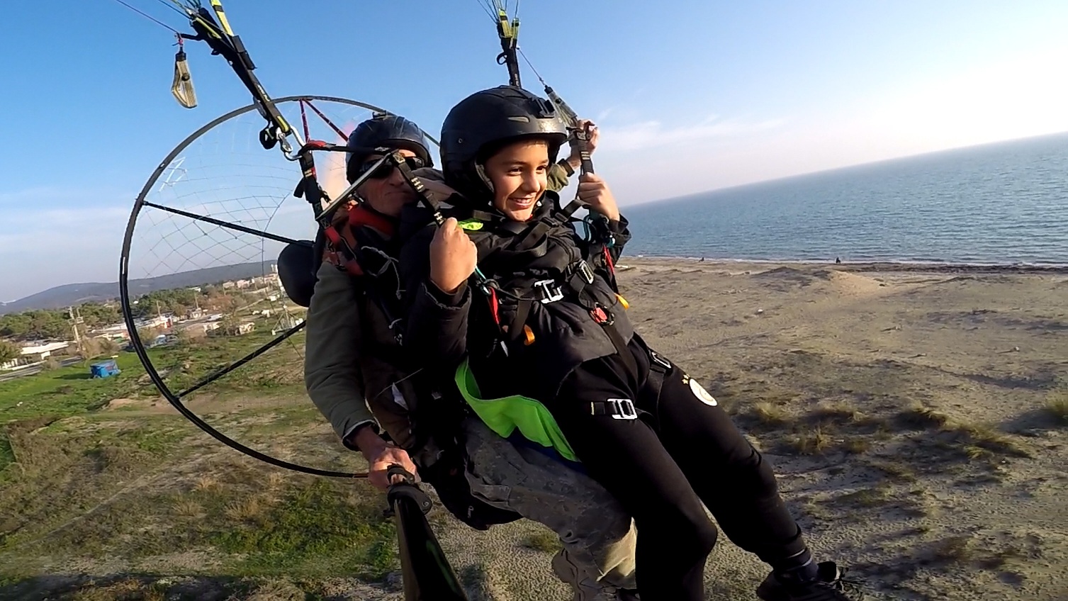 Mecidiye İlkokulu anasınıfı öğrencisi Hamza İstemi ve 4’üncü sınıf öğrencisi Seyit İstemi kardeşler, aileleriyle gittikleri Mecidiye köyü sahilinde paramotor pilotu Yılmaz Özkaya tarafından paramotorla uçuş yaptılar.
