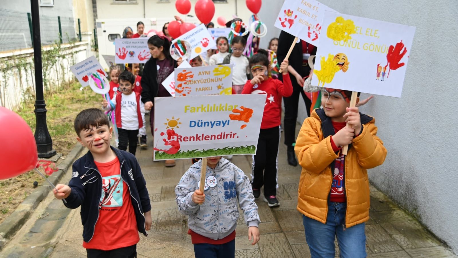 Etkinlikte çocuklar, “Beni olduğum gibi kabul et, bu bana yeter.”, “Otizm, hayatın bir parçasıdır.”, “Benim dünyam çok renkli, katılmak ister misin?” ve “Renklerimiz farklı, kalplerimiz aynı.” vb. yazılı pankart ve dövizlerle farkındalık yürüyüşü gerçekleştirdi.
