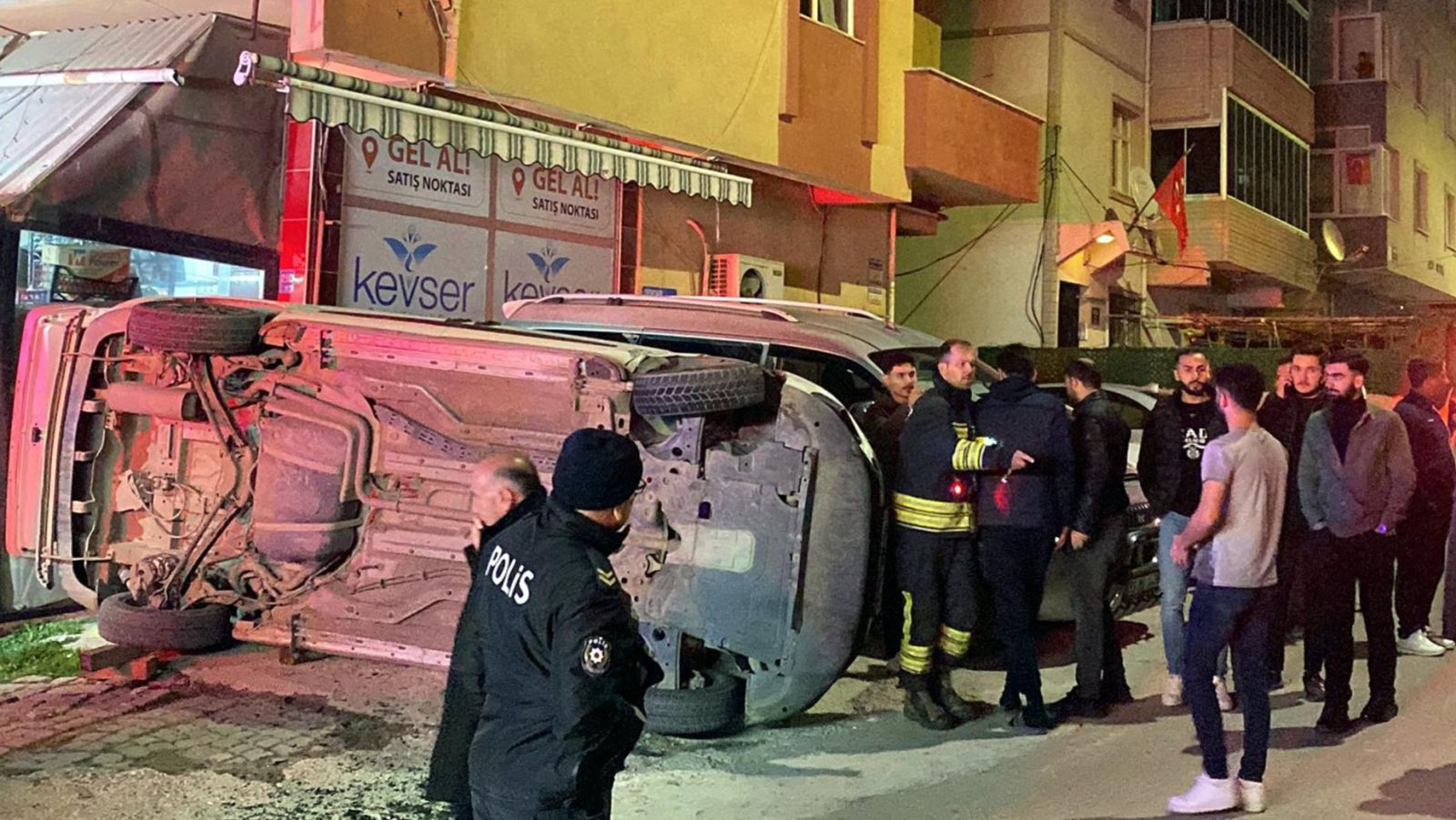 Takla atan otomobim yol kenarındaki marketin girişinde yan yattı. İhbar üzerine kaza yerine polis, sağlık ve itfaiye ekipleri sevk edildi.