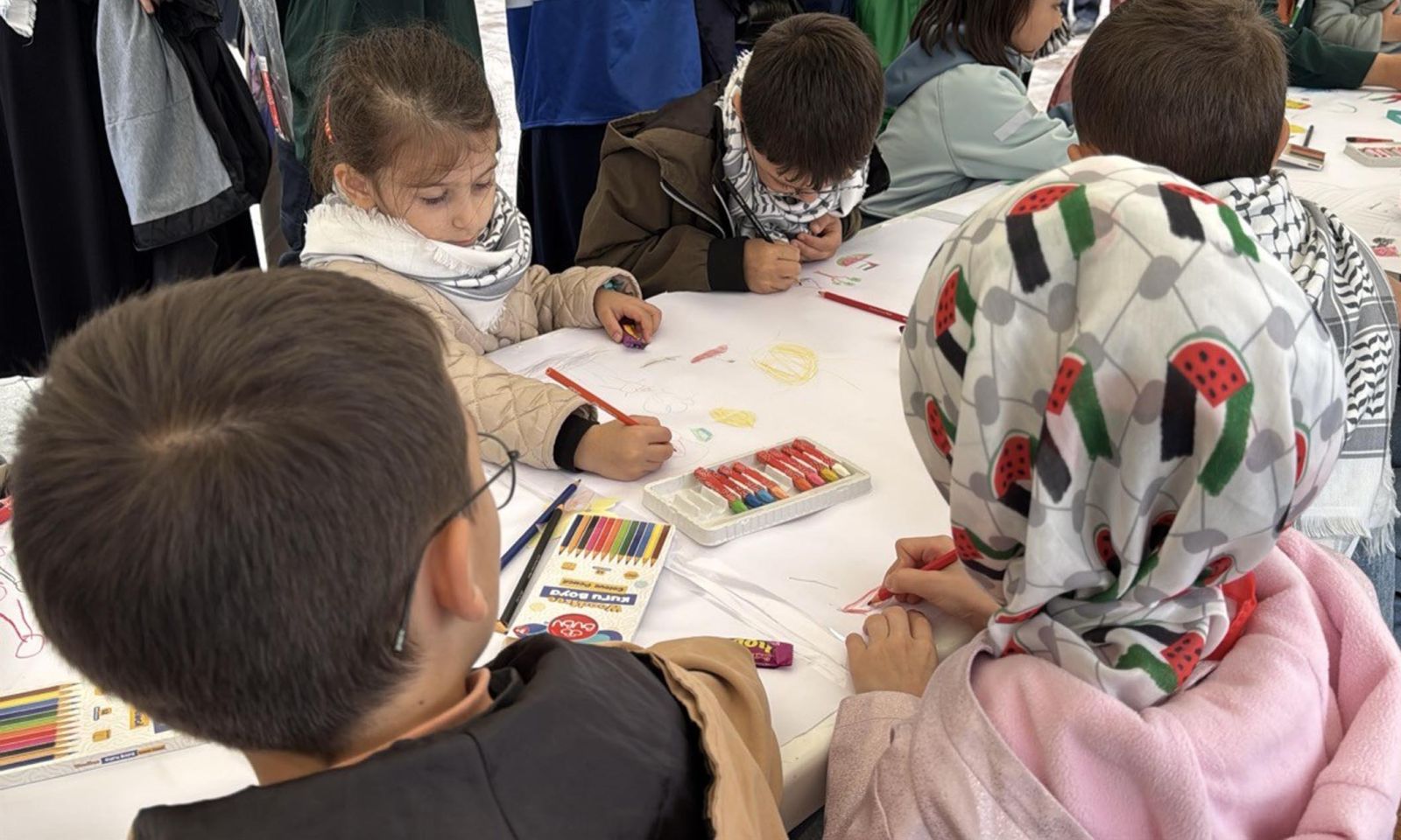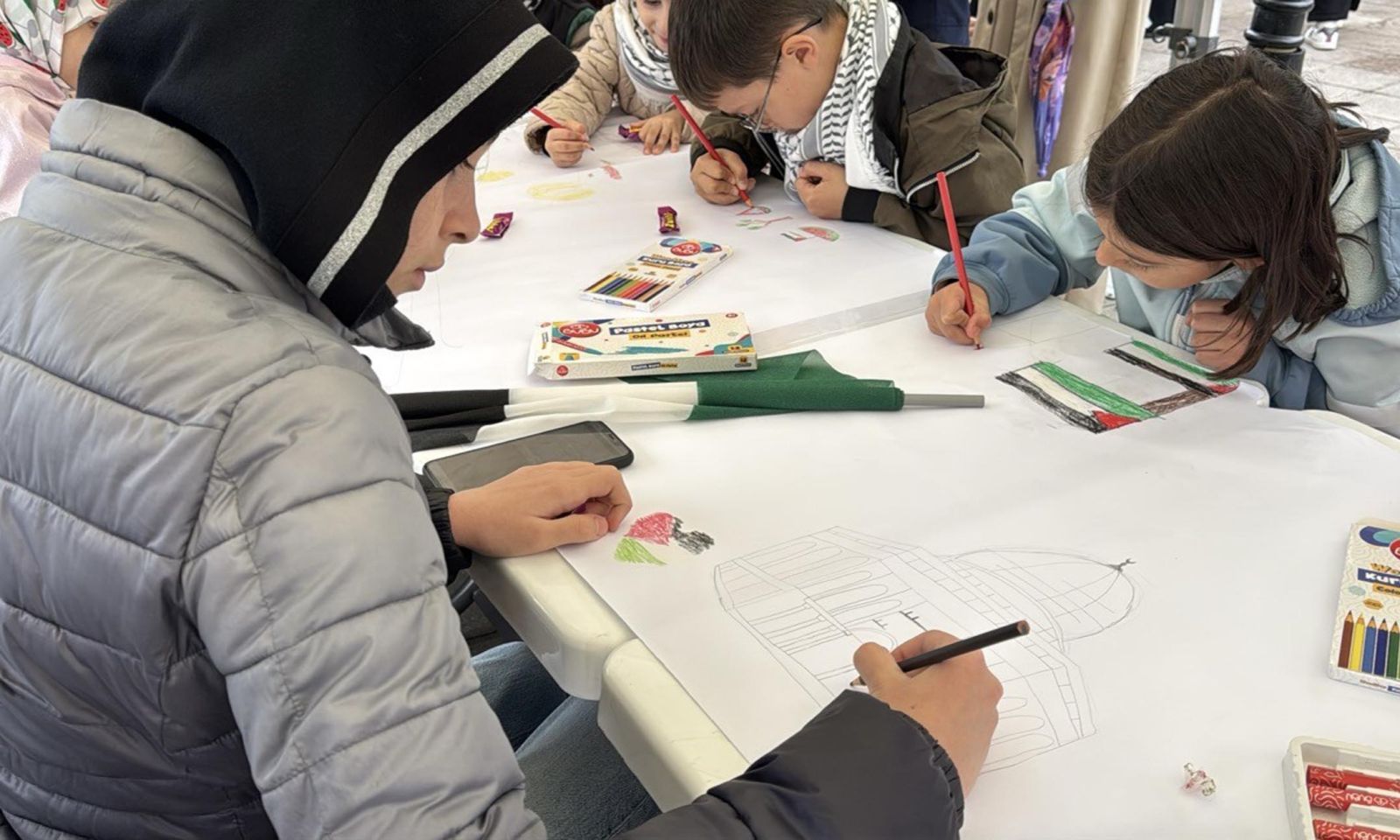 Meydanda toplanan kalabalık, sloganlar atarak İsrail'in saldırılarını durdurmasını talep etti. Meydanda aynı zamanda çocuklar içinde alan kuruldu. Kurulan alana gelen çocuklar, Gazze'de yaşayan çocuklar için resim çizme etkinliği gerçekleştirdi. Çocuklar, Filistin bayrağı ile Mescid-i Aksa'yı resmetti.