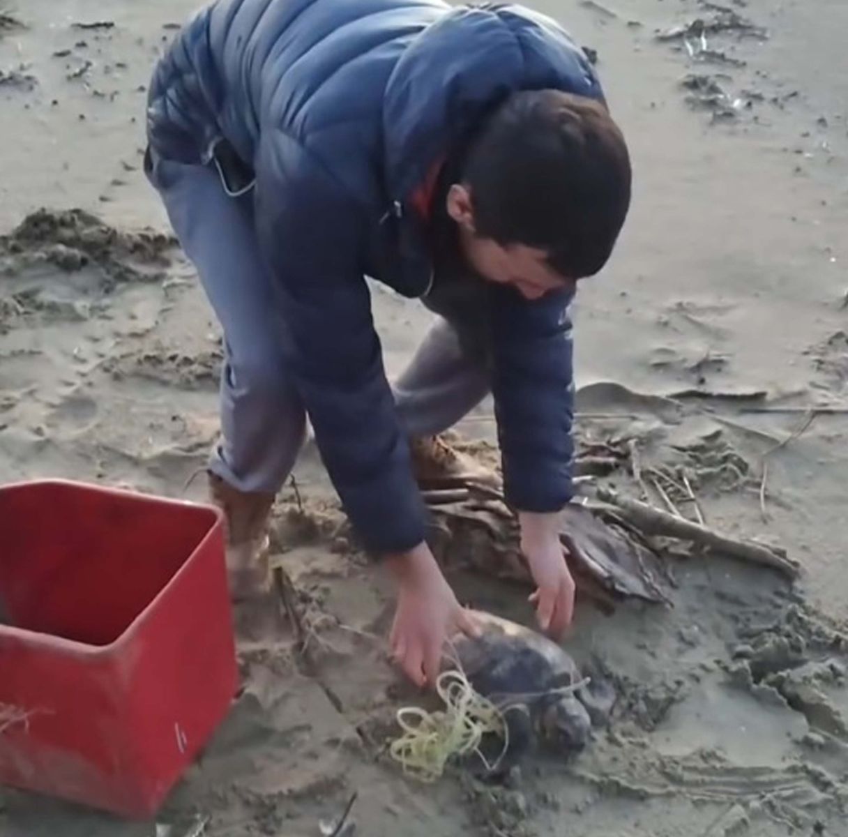Kılıç ve arkadaşları yanına gittikleri kaplumbağanın misina ile ipe dolandığını gördükten sonra caretta carettayı kurtarıp, doğal ortamına geri bıraktı.