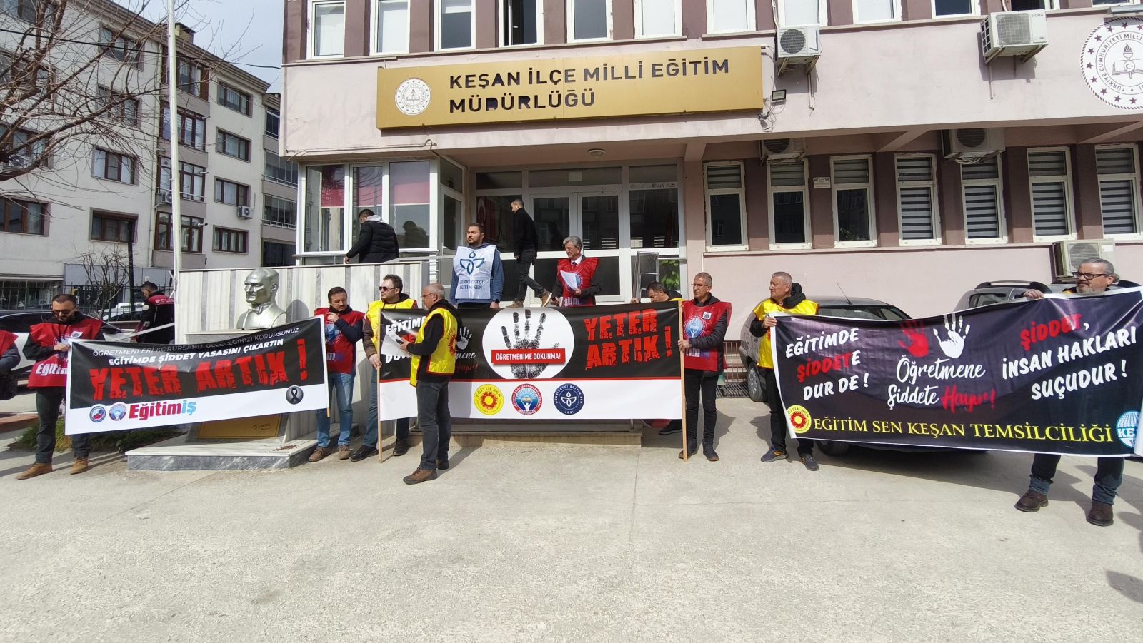 Basın açıklamasını okuyan Eğitim-İş Keşan Temsilcilik Başkanı Erol Yazla, eğitim çalışanlarına yönelik şiddet eylemlerinin katalog suçlar kapsamına alınması gerektiğini belirterek, “Caydırıcı ve ağır yaptırımlar içeren özel yasal düzenleme ivedilikle hayata geçirilmelidir. Ortaöğretim kurumlarında disiplin mekanizması işlevsel ve etkin hale getirilmelidir.