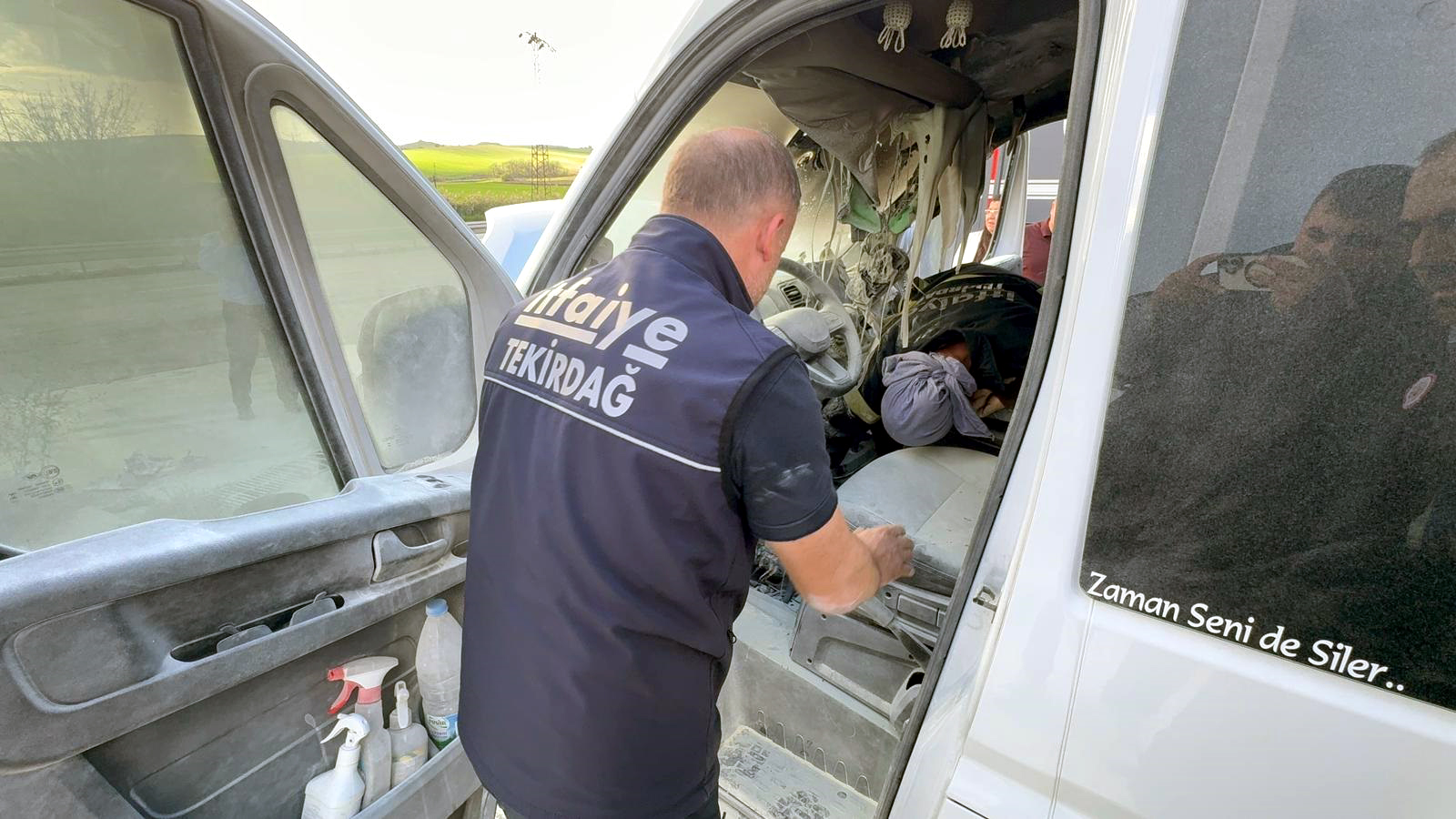 Yangında, minibüsün kullanılamaz hale geldi. Jandarma yangınla ilgili inceleme başlattı. (DHA)