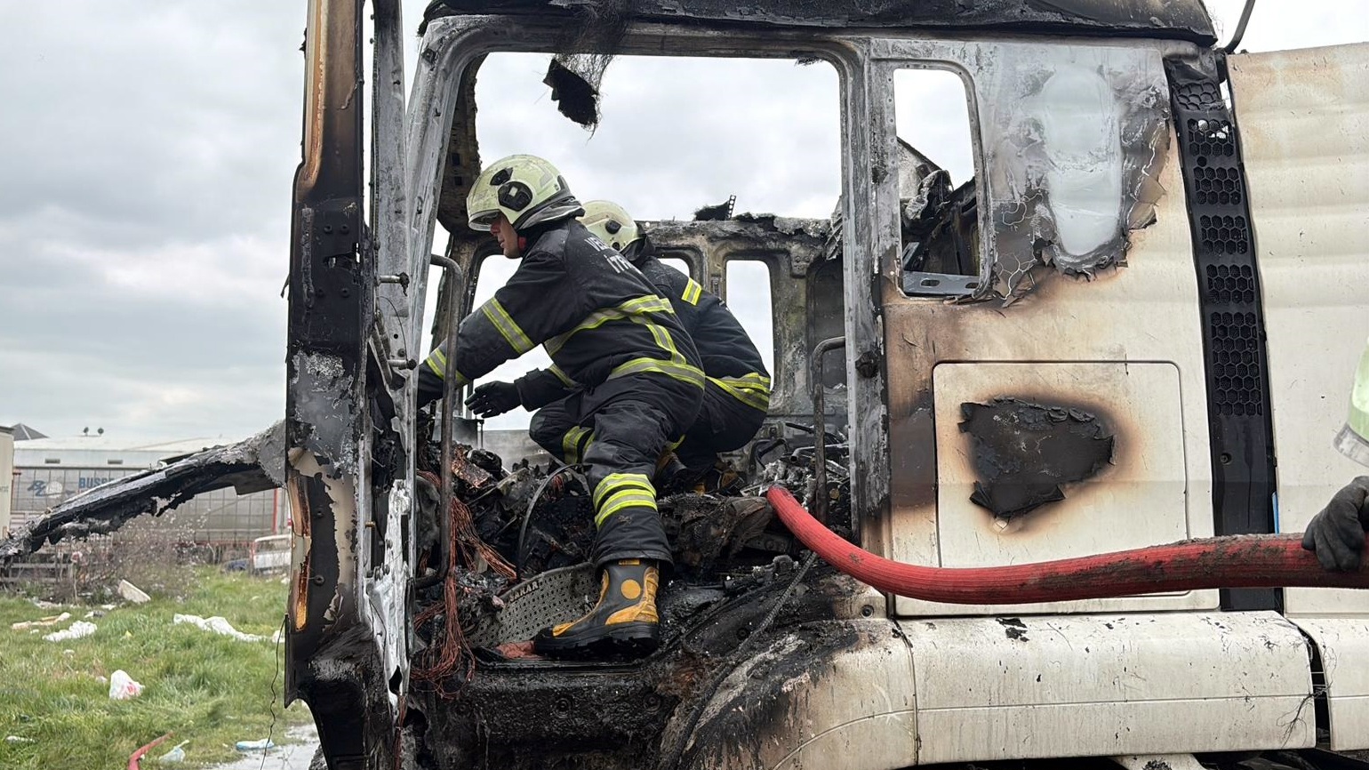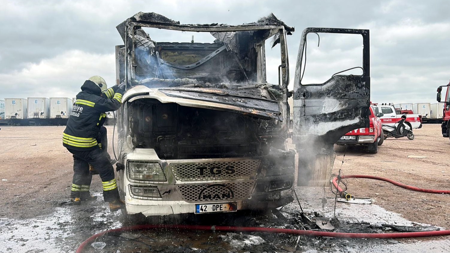 Yangında TIR kullanılamaz hale gelirken, inceleme başlatıldı. (DHA)