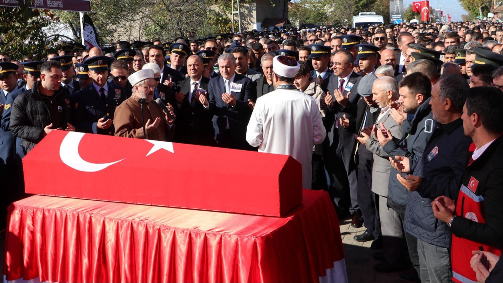Tekirdağ Müftüsü Mustafa Soykök'ün kıldırdığı cenaze namazının ardından şehit İlker Aykut, Kırkkepenek Mahallesi Mezarlığı'nda toprağa verildi. (DHA)