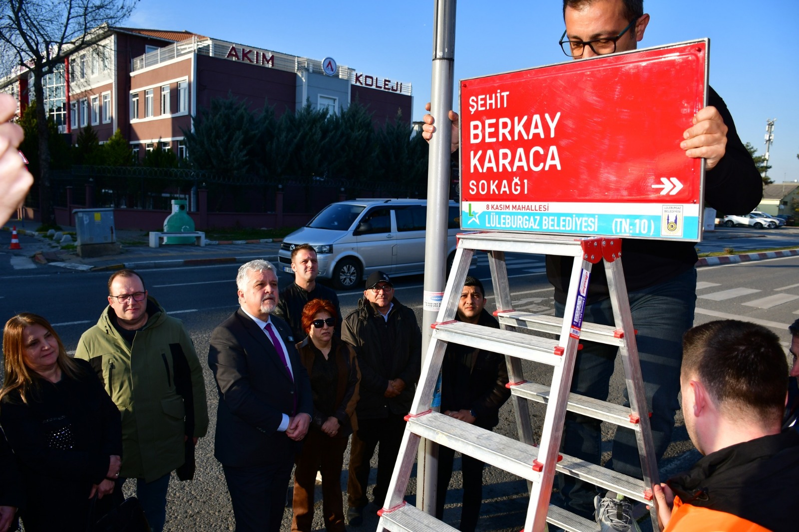 Şehit Berkay Karaca’nın adının Lüleburgaz’da sonsuza kadar yaşayacağını söyleyen Başkan Gerenli şöyle konuştu; “Meclisimizin aldığı karar doğrultusunda kahraman şehidimiz Hava Uçak Bakım Astsubay Üstçavuş Berkay Karaca'nın ismini verdiğimiz durak ve sokağa isim levhalarını şehidimizin ailesi ve belediye meclis üyelerimizle yerleştirdik. Kahraman şehidimizin aziz hatırasını ilelebet yaşatacağız.”