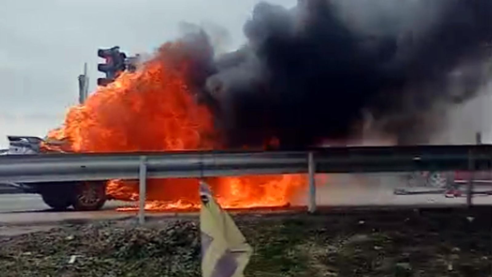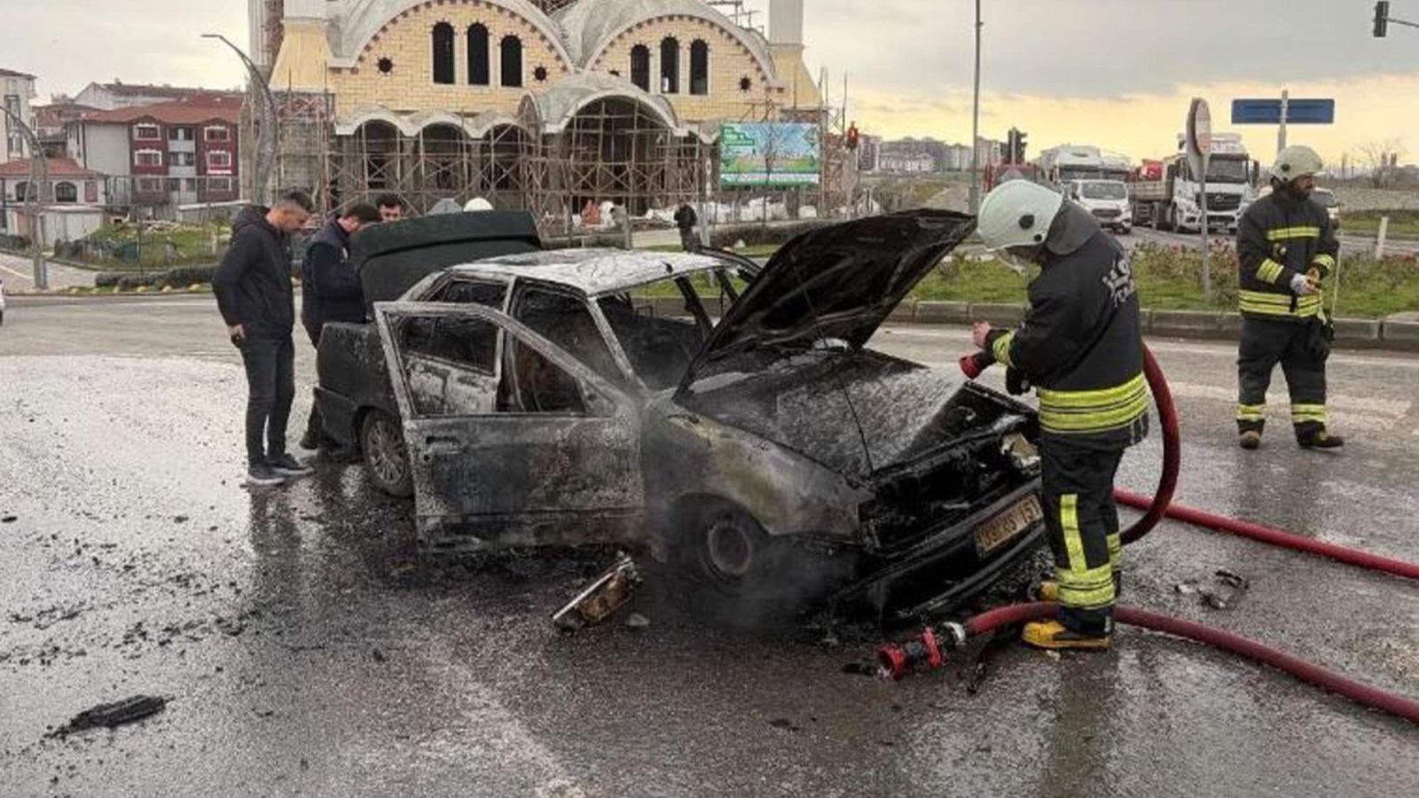 Alevleri fark eden sürücü, aracı yolun sağına park edip indi. Alevler kısa sürede otomobili sardı.