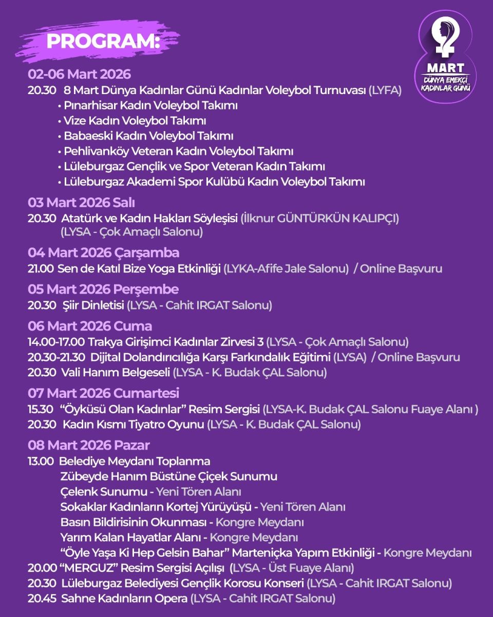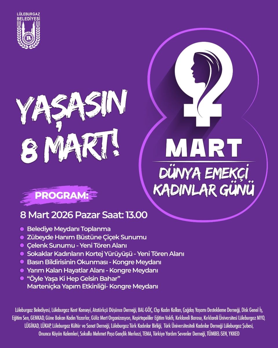 Lüleburgaz Belediyesi ve kent paydaşlarının işbirliği ile 8 Mart Dünya Emekçi Kadınlar Günü’ne özel etkinlik programı hazırlandı.