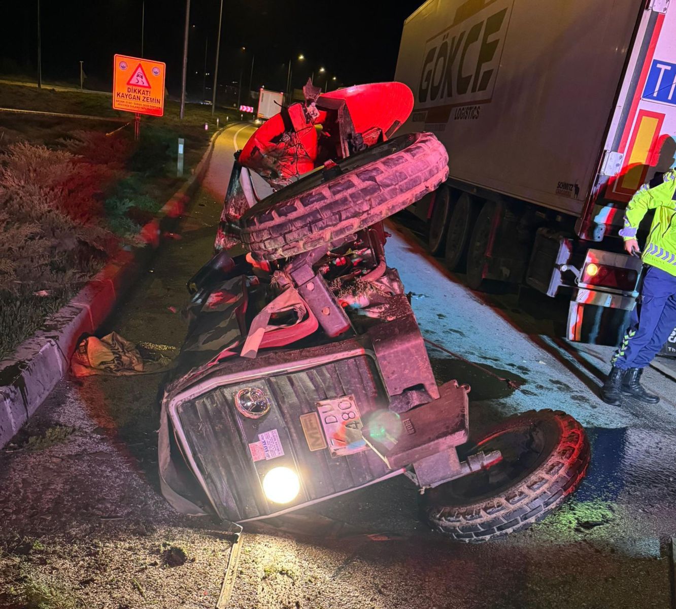 Ezine’den Ayvacık istikametine seyir halinde olan B.Ç.’nin yönetimindeki 59 AIL 476 plakalı TIR ile Bozcaada Kavşağı’nda Necdet Özcan yönetimindeki 17 DU 480 plakalı traktöre çarptığı ileri sürüldü.