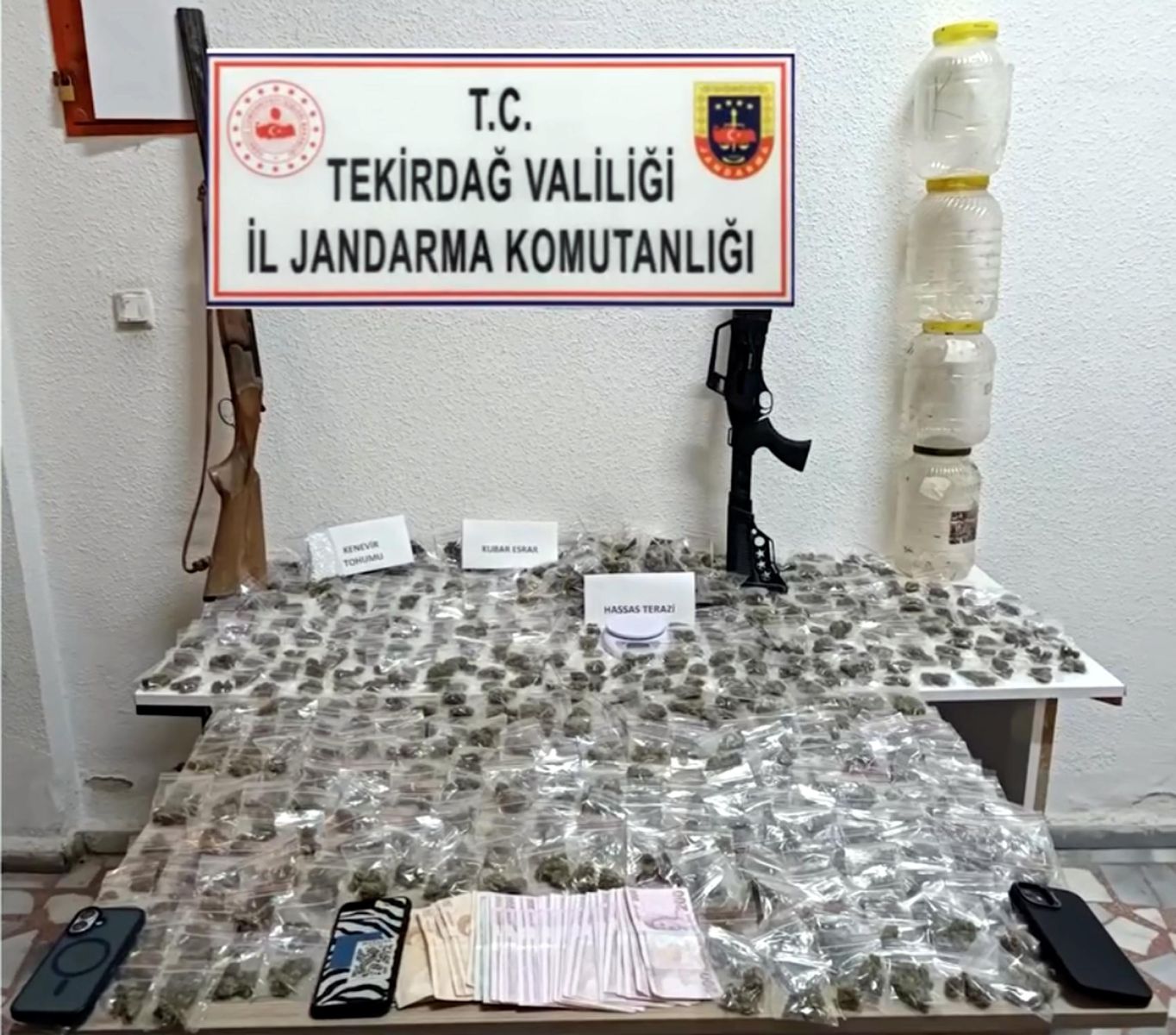Ekiplerin bahçe ve kümeste yaptığı kazılarda plastik şişeler içinde satışa hazır 1 kilo 868 gram kubar esrar, bir miktarı kenevir tohumu, 2,89 gram kenevir tohumu, hassas terazi, ruhsatsız 2 av tüfeği, suçtan elde edildiği değerlendirilen 6 bin 930 lira ile 3 cep telefonu ele geçirildi. Y.K., gözaltına alındı.